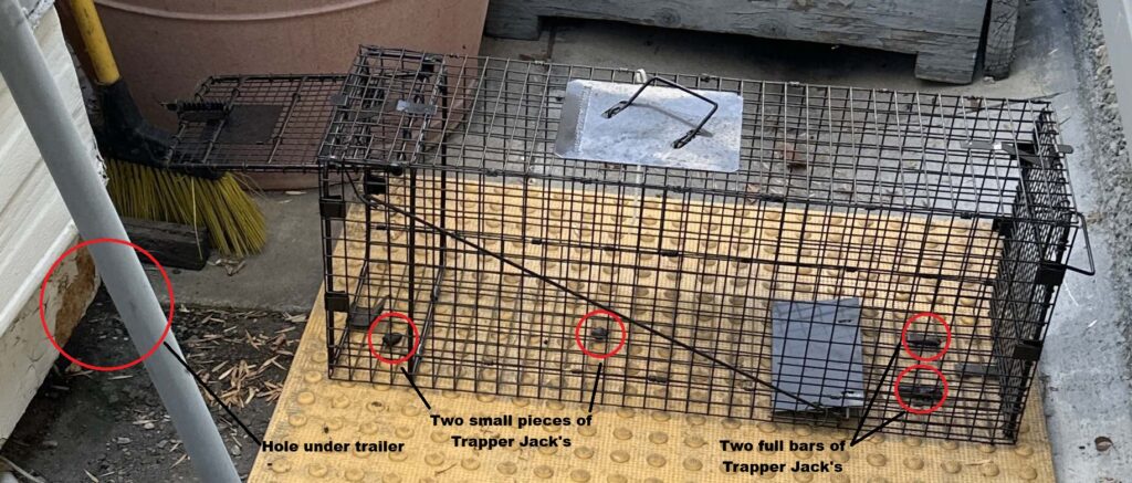 He carefully placed the open end of the trap about 12 inches from the opening in the trailer’s skirting. His thinking was that he wanted the skunk to be able to walk around the trailer without being blocked by the trap. He also knew that when the skunk passed between the trailer and the trap, it would smell the aromatic aroma of Trapper Jacks Macadamia Rodent Lure.